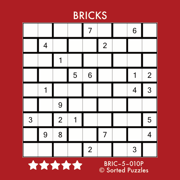Bricks [BRIC-5-010P]Sorted PuzzlerSeptember 27, 2025Number Placement Puzzle (PDF) Solve Online Solution (PDF) Example Puzzle: Solution: Want more Bricks puzzles? Get the puzzle book!US, CA; UK, DE, FR, ES, IT, other Bricks Puzzle Archive Similar Puzzle Books Ready, Steady, Solve! Nanro US, CA; UK, DE, FR, ES, IT, other Nanro Puzzle Archive 1000 Number Logic Puzzles US, CA; UK, DE, FR, ES, IT, other More Info Ready, Steady, Solve! Number Ball US, CA; UK, DE, FR, ES, IT, other Number Ball Puzzle Archive Previous Post Nuribou [NUBU-2-007P] Next Post Dotchi-Loop [DOLO-1-006P]
