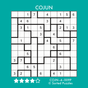 Fillmat [FMAT-2-007P]Sorted PuzzlerJuly 14, 2025Grid Division Puzzle (PDF) Solve Online Solution (PDF) Example Puzzle: Solution: Want more Tatami puzzles? Get the puzzle book!US, CA; UK, DE, FR, ES, IT, other Fillmat Puzzle Archive Similar Puzzle Books Ready, Steady, Solve! Slash Pack US, CA; UK, DE, FR, ES, IT, other Slash Pack Puzzle Archive Domino Logic Puzzles US, CA; UK, DE, FR, ES, IT, other Puzzles in this book: Dominosa, Bricks, Dominion, Norinori, Neighboring Dominoes Ready, Steady, Solve! Usotatami US, CA; UK, DE, FR, ES, IT, other Usotatami Puzzle Archive Previous Post Cojun [COJN-4-009P] Next Post Kakuro [KAKU-2-002P]