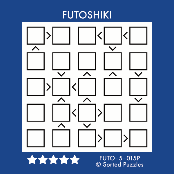 Futoshiki [FUTO-5-015P]Sorted PuzzlerNovember 12, 2025Number Placement Puzzle (PDF) Solve Online Solution (PDF) Example Puzzle: Solution: Want more Futoshiki puzzles? Get the puzzle book!US, CA; UK, DE, FR, ES, IT, other Futoshiki Puzzle Archive Similar Puzzle Books Ready, Steady, Solve! Nanro US, CA; UK, DE, FR, ES, IT, other Nanro Puzzle Archive the BIG puzzle book of Renban US, CA; UK, DE, FR, ES, IT, other Renban Puzzle Archive Puzzles on the Brain – Issue 5 US, CA; UK, DE, FR, ES, IT, NL, PL, SE; JP, AU August 2025 Previous Post Toroidal Snake [TSNK-4-014P] Next Post Context [CTXT-2-007P]