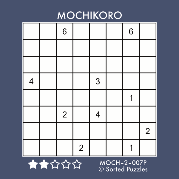 Mochikoro [MOCH-2-007P]Sorted PuzzlerNovember 9, 2025Shading/Pattern Puzzle (PDF) Solve Online Solution (PDF) Example Puzzle: Solution: Want more Mochikoro puzzles? Get the puzzle book!US, CA; UK, DE, FR, ES, IT, other Mochikoro Puzzle Archive Similar Puzzle Books Shading and Pattern Logic Puzzles – Collection I US, CA; UK, DE, FR, ES, IT, other Puzzles in this book: Hitori, Look-Air, SquarO, Kurotto, Chiyotsui 1000 Nurikabe & Variants US, CA; UK, DE, FR, ES, IT, other More Info Puzzles on the Brain – Issue 2 US, CA; UK, DE, FR, ES, IT, NL, PL, SE; JP, AU May 2025 Previous Post Sum Skyscrapers [SSKY-3-008P] Next Post Moon or Sun [MSUN-5-015P]