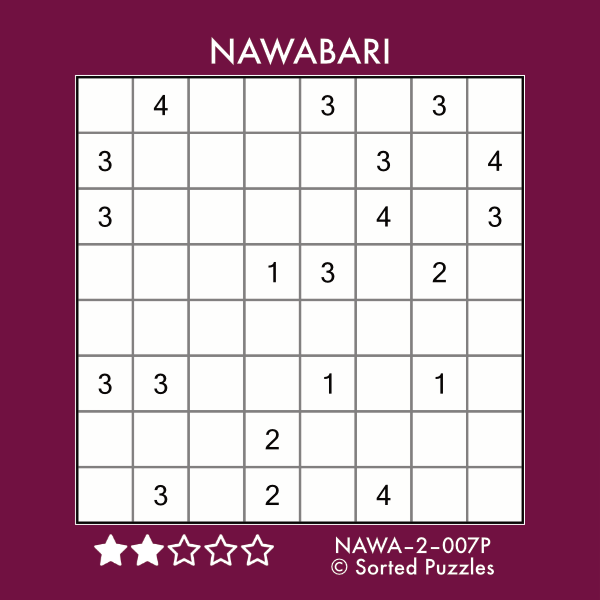 Nawabari [NAWA-2-007P]Sorted PuzzlerFebruary 17, 2026Grid Division Puzzle (PDF) Solve Online Solution (PDF) Example Puzzle: Solution: Want more Nawabari puzzles? Get the puzzle book!US, CA; UK, DE, FR, ES, IT, other Nawabari Puzzle Archive Similar Puzzle Books Grid Division Logic Puzzles – Collection III US, CA; UK, DE, FR, ES, IT, other Puzzles in this book: Shikaku, Gemini Blocks, Unlike Mosaic, Sukima, Trinudo Puzzles on the Brain – Issue 3 US, CA; UK, IE, DE, FR, BE, ES, IT, NL, PL, SE; JP, AU June 2025 Twin & Symmetry Logic Puzzles US, CA; UK, DE, FR, ES, IT, other Puzzles in this book: Gemini Blocks, Kapama, Tetoron, Chiyotsui, Kuroclone Previous Post Index Sums [INDE-5-015P] Next Post Curving Road [CURV-5-010P]
