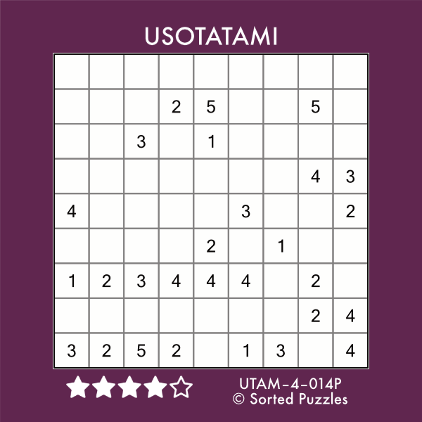 Usotatami [UTAM-4-014P]Sorted PuzzlerAugust 22, 2025Grid Division Puzzle (PDF) Solve Online Solution (PDF) Example Puzzle: Solution: Want more Usotatami puzzles? Get the puzzle book!US, CA; UK, DE, FR, ES, IT, other Usotatami Puzzle Archive Similar Puzzle Books Domino Logic Puzzles US, CA; UK, DE, FR, ES, IT, other Puzzles in this book: Dominosa, Bricks, Dominion, Norinori, Neighboring Dominoes Tatami Logic Puzzles US, CA; UK, DE, FR, ES, IT, other Puzzles in this book: Fillmat, Patchwork, Tatamibari, Set Carpets, Usotatami Twin & Symmetry Logic Puzzles US, CA; UK, DE, FR, ES, IT, other Puzzles in this book: Gemini Blocks, Kapama, Tetoron, Chiyotsui, Kuroclone Previous Post Pipelink [PIPE-4-014P] Next Post LITS [LITS-3-013P]